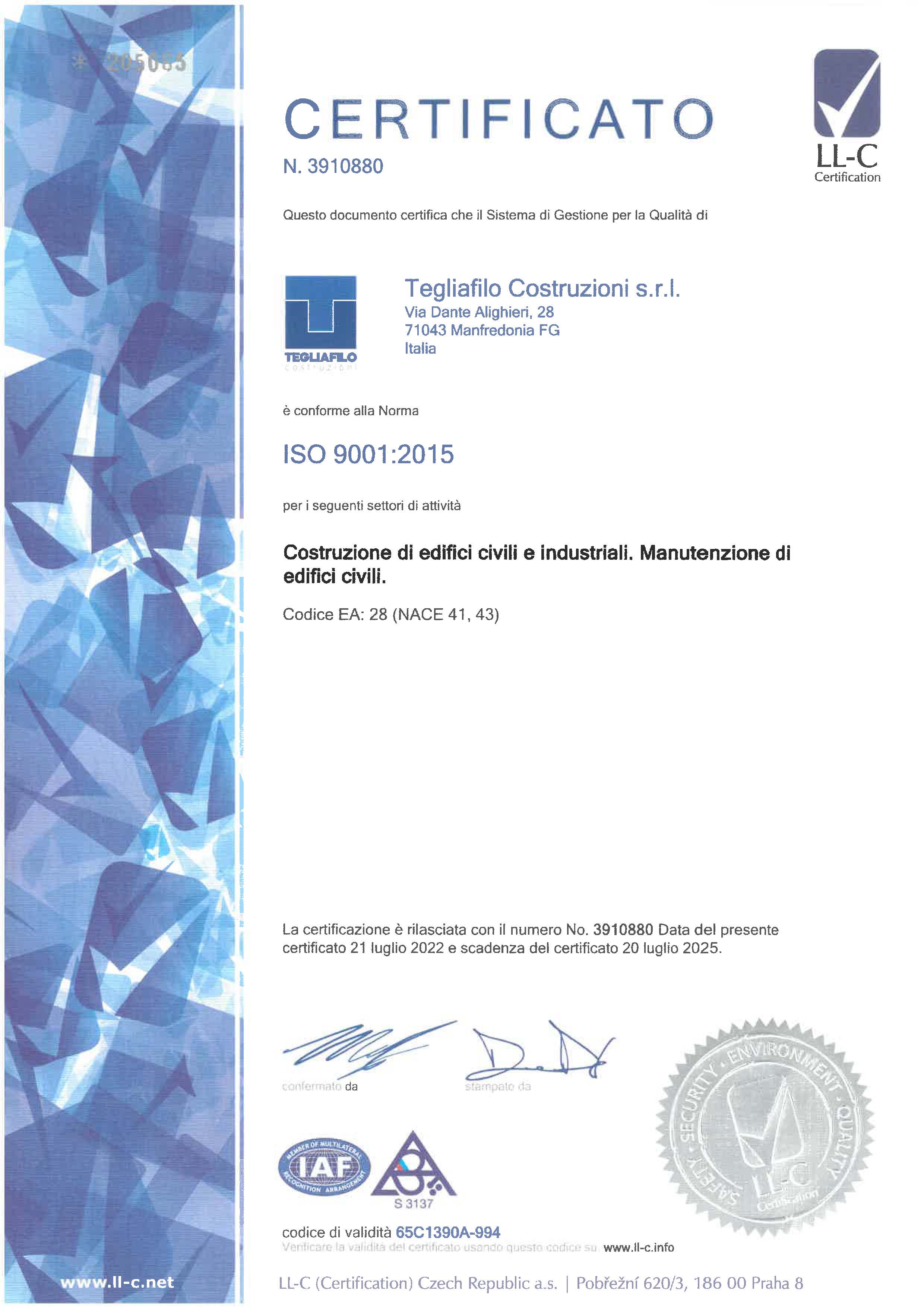 A testimonianza di questo impegno, Tegliafilo Costruzioni ha ottenuto l’approvazione da parte degli organismi di certificazione competenti.